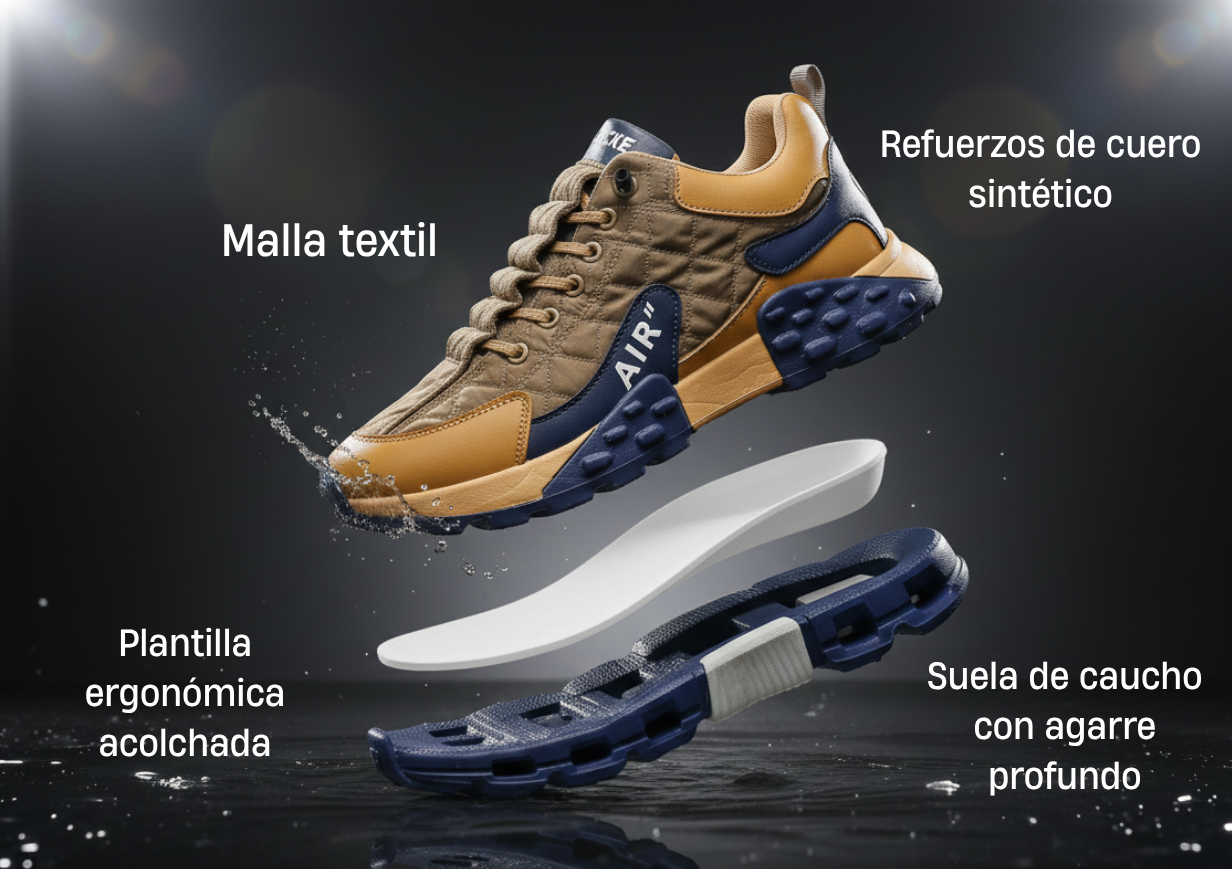 Todo comenzó con una promesa simple: ¿y si cada día pudiera sentirse ligero sin sacrificar estilo? Los diseñadores de Flex Air entendieron que el confort verdadero no es pasivo—es activo, inteligente, adaptable. La historia empieza con una malla textil transpirable que respira cuando más lo necesitas, reforzada estratégicamente con cuero sintético en puntera y laterales que garantiza durabilidad kilómetro tras kilómetro.